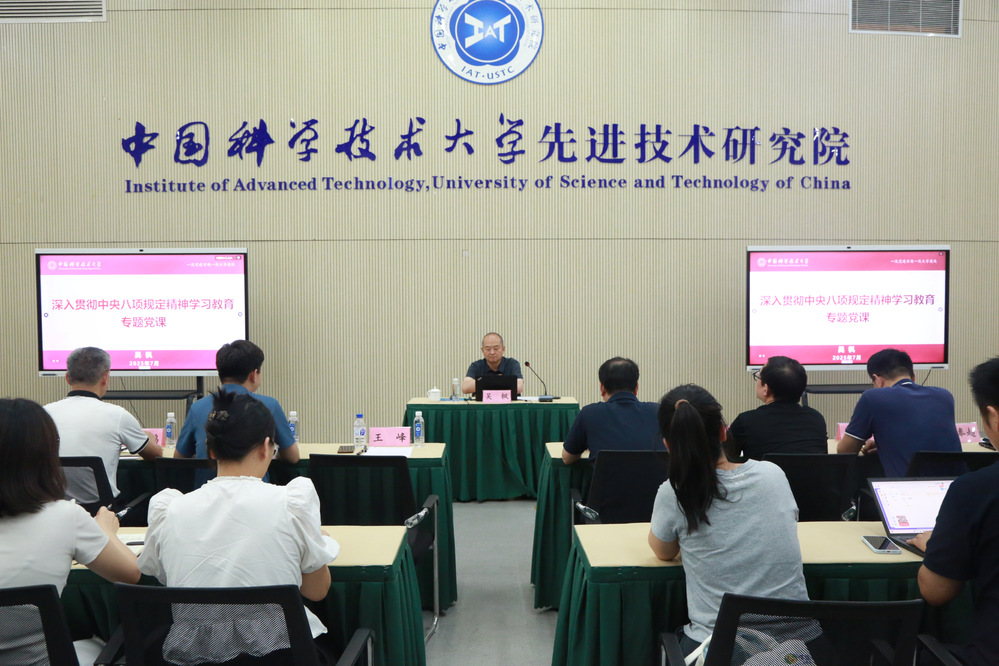 为深入推动全面从严治党向纵深发展,确保中央八项规定精神入脑入心、扎根生效,7月4日下午,先进技术研究院党委开展深入贯彻中央八项规定精神学习教育专题党课。校党委常委、副校长吴枫为科技成果转化院、先进技术研究院、人工智能研究院、科大资产公司全体党员等100余人上专题党课。党课由先进技术研究院党委书记王峰主持。